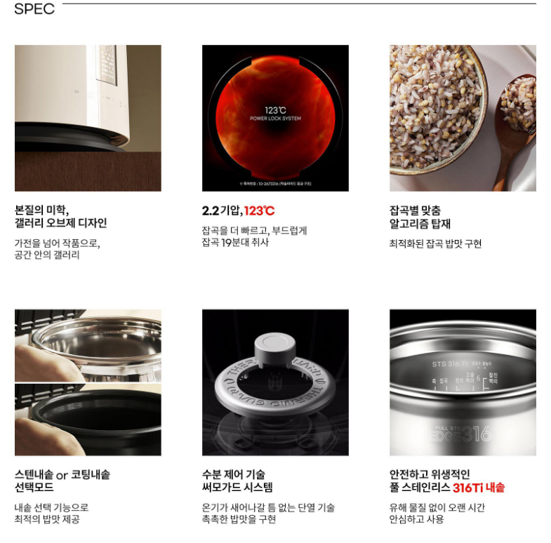 풀스테인리스 내솥 + 듀얼프레셔 + IH 가열 방식을 모두 적용한 것이 특징입니다.